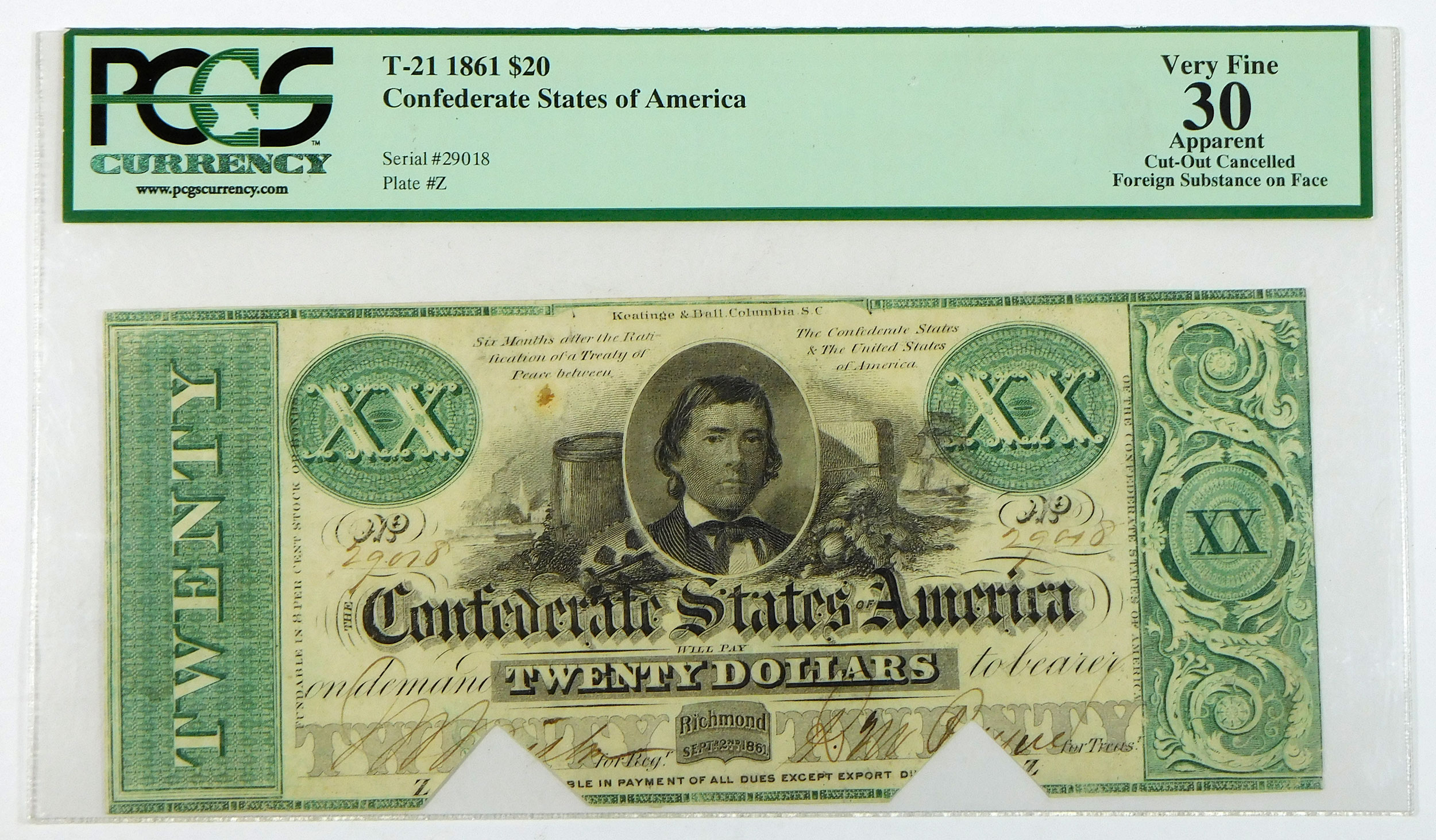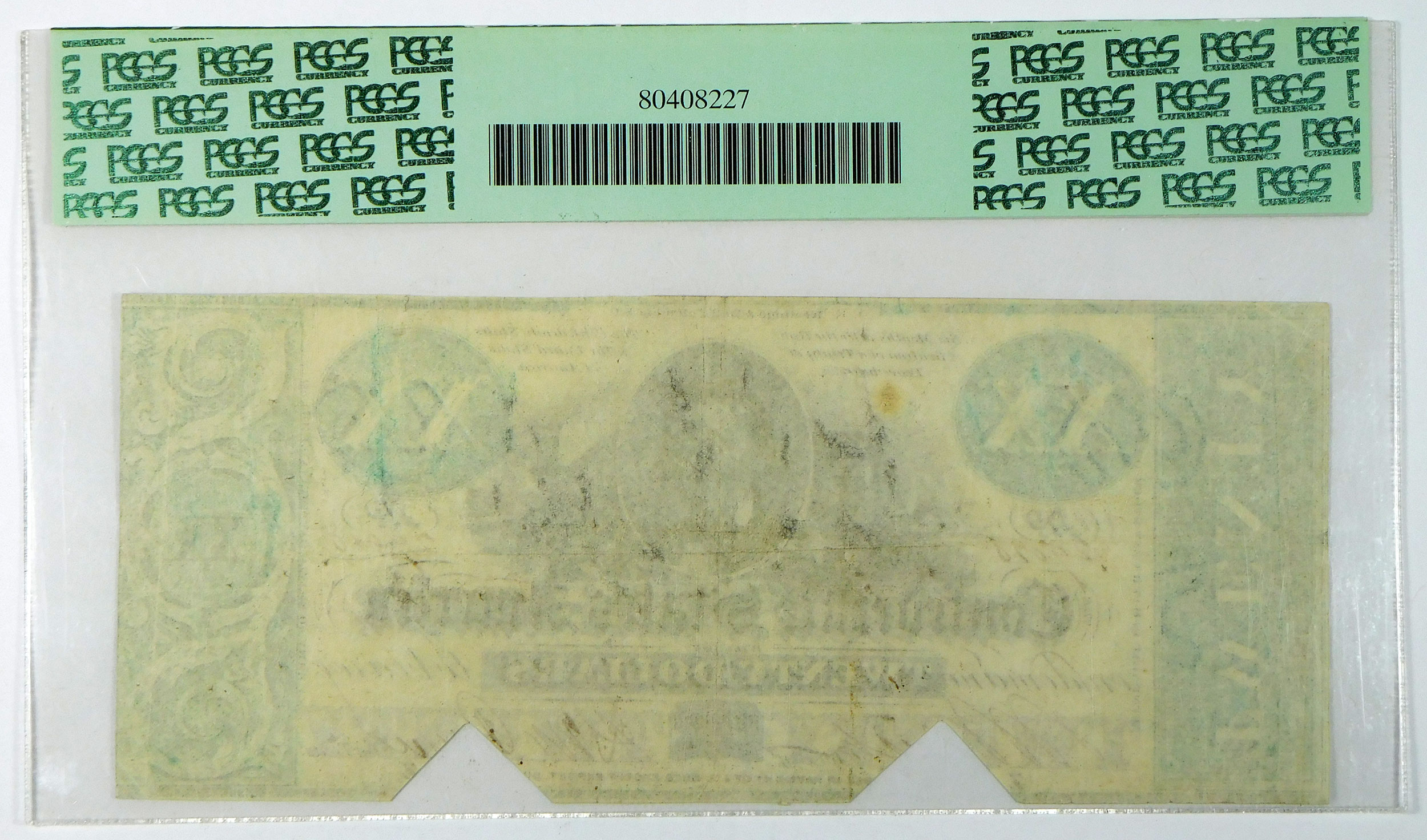 The note has been cut cancelled, there is a foreign substance on the face and there are several pinholes.