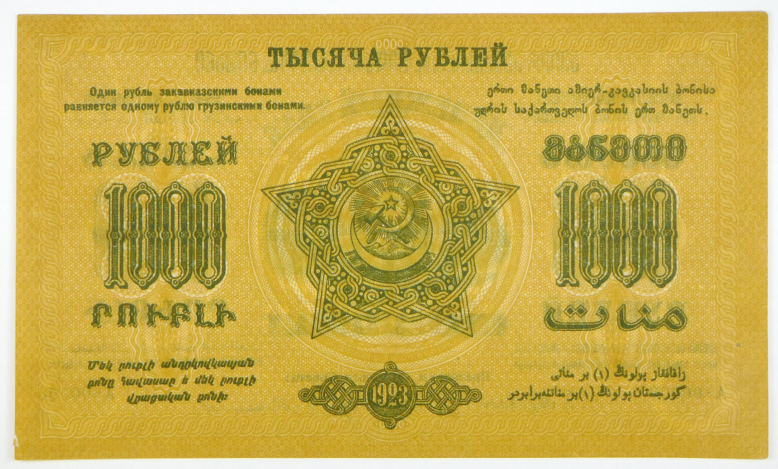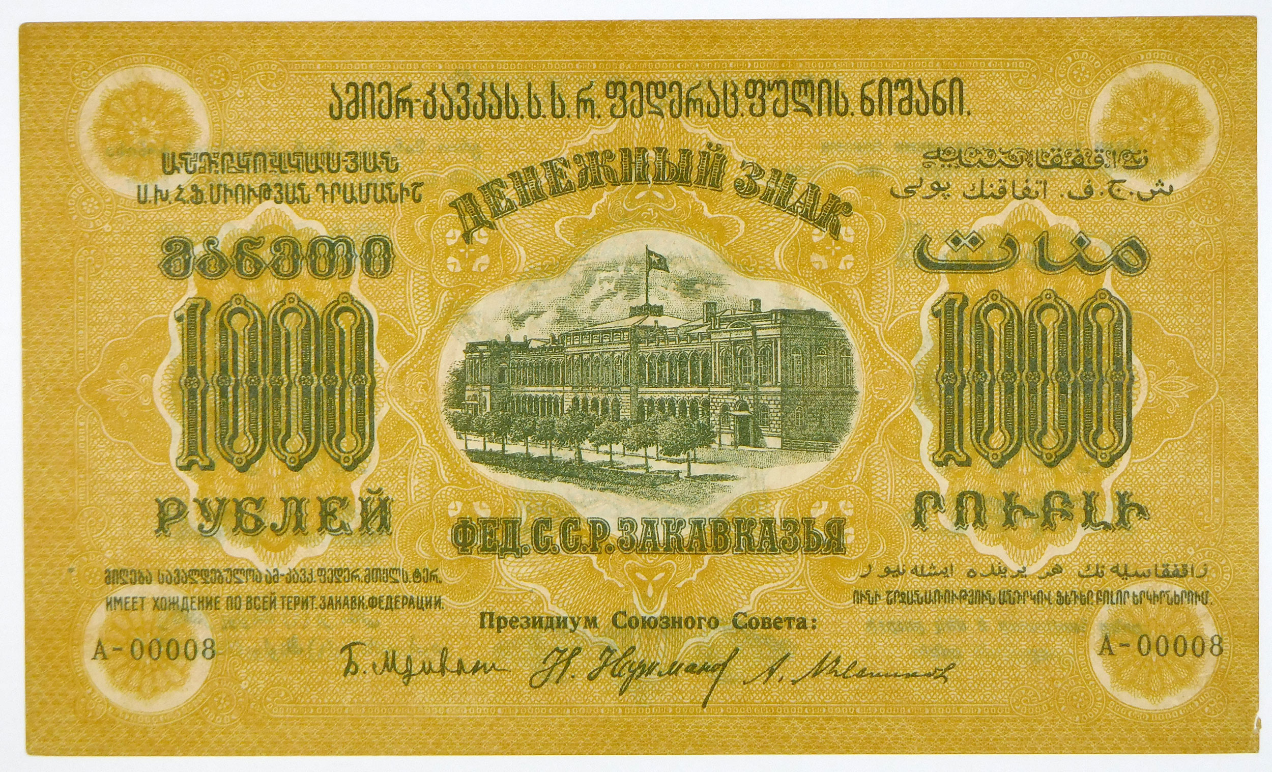 Nice crisp note with sharp edges. There is a small tear at the bottom right corner. Issued in Transcaucasia.