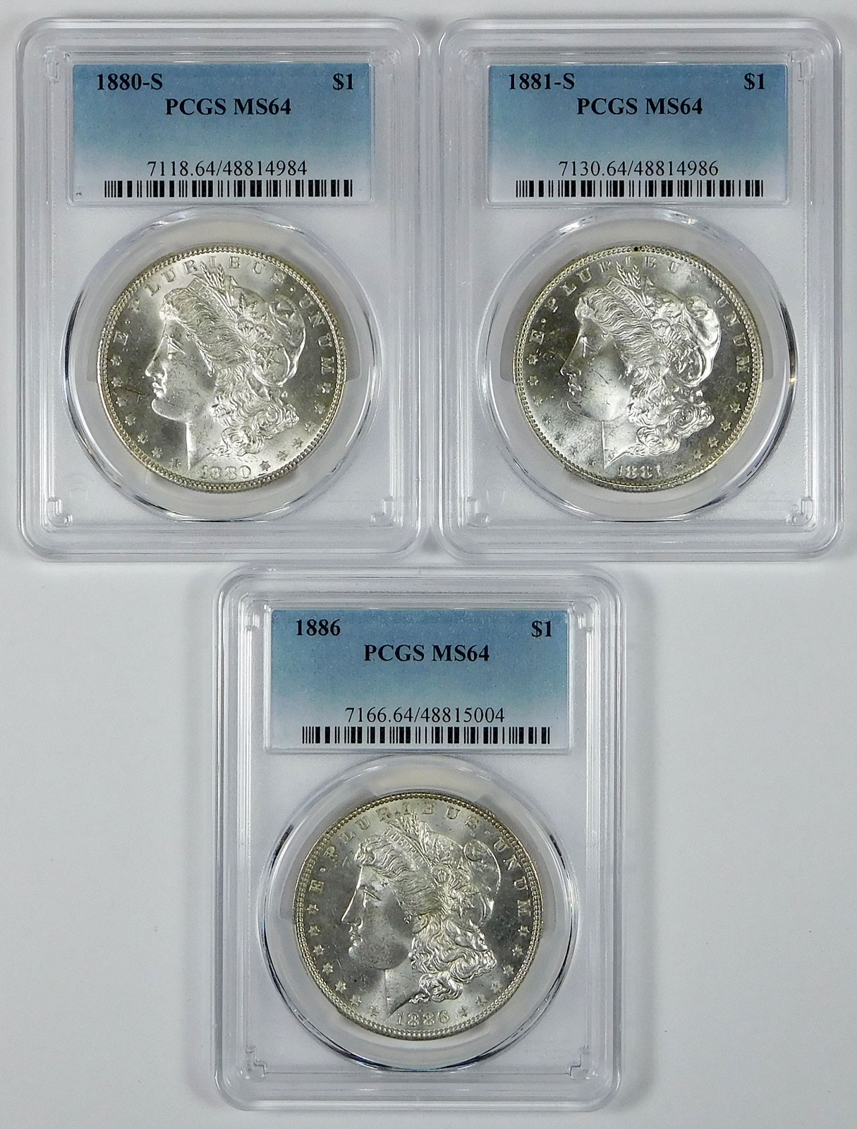 1880-S, 1881-S & 1886 Morgan Silver Dollar Set – PCGS MS 64