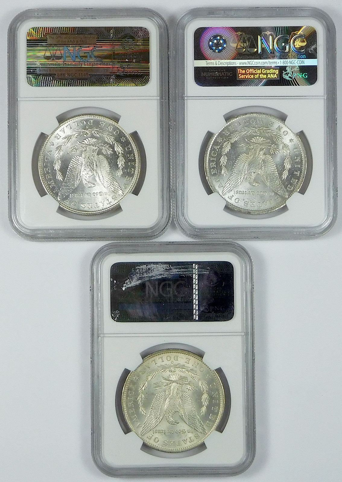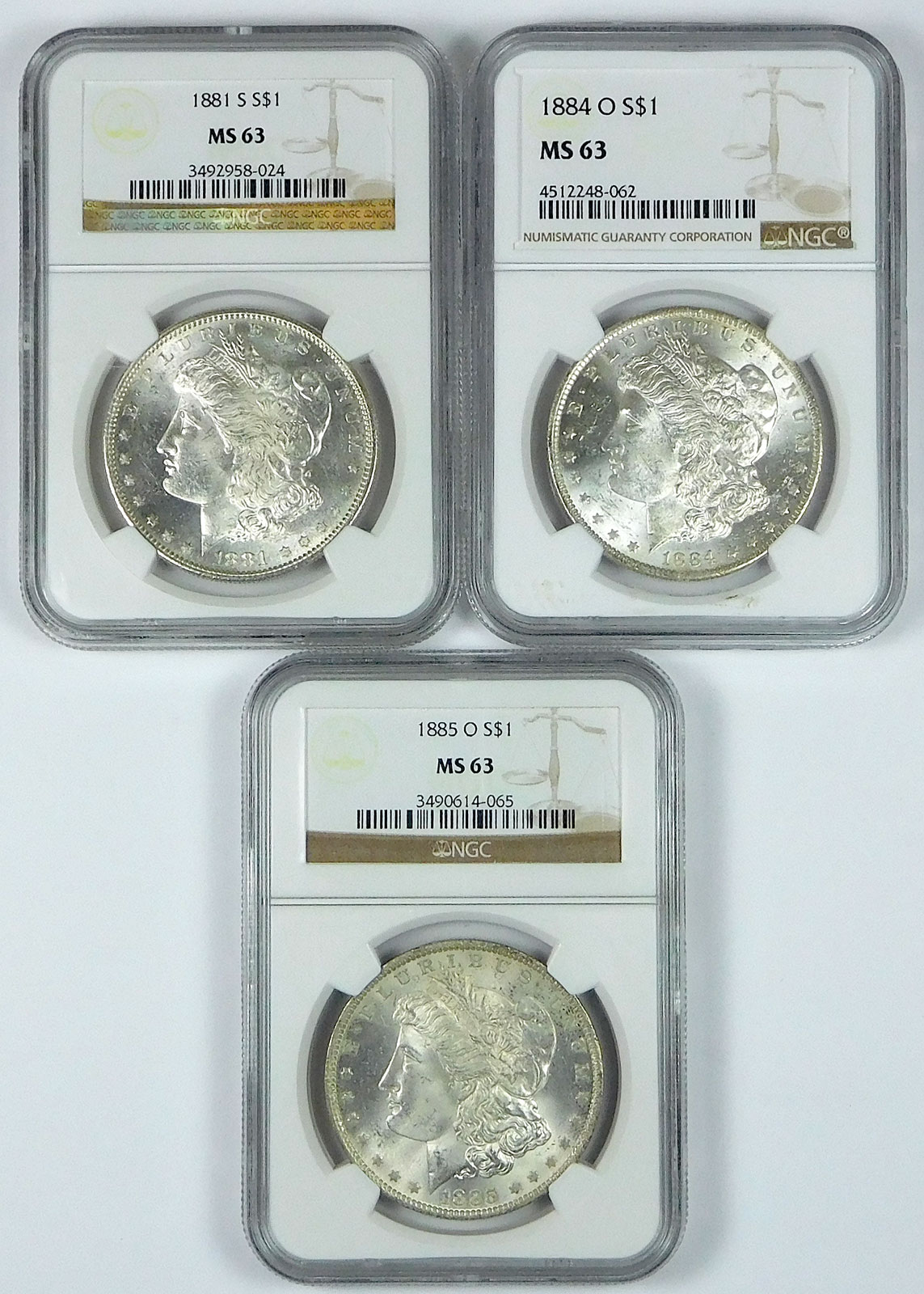 1881-S, 1884-O & 1885-O Morgan Silver Dollar Set – NGC MS 63