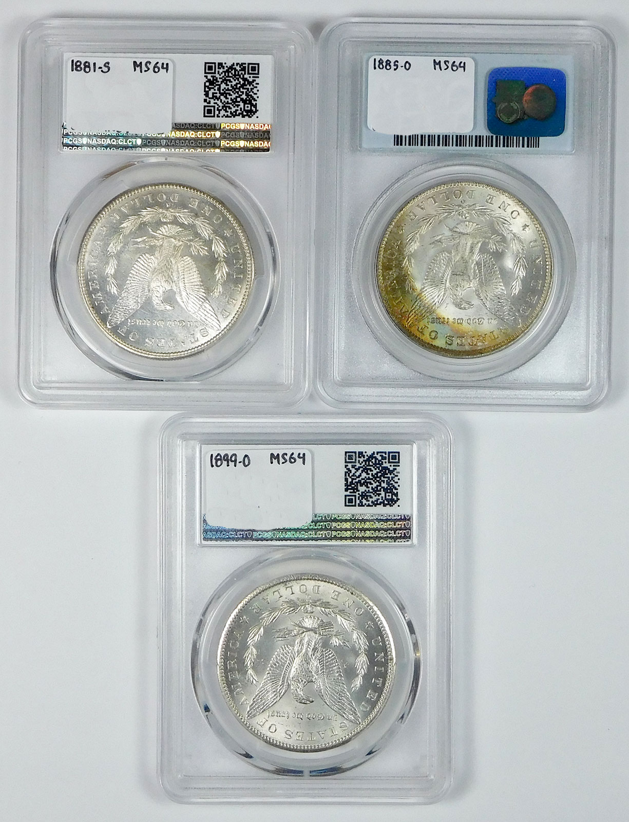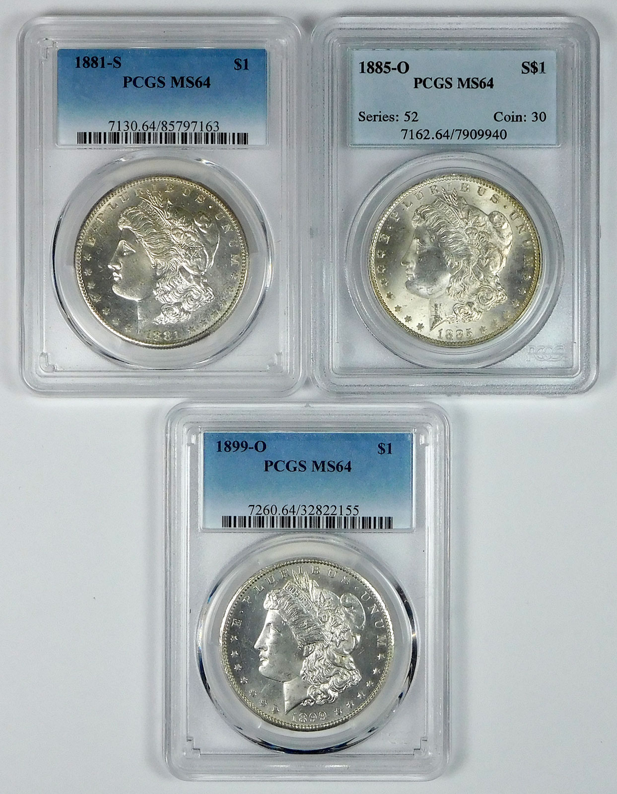 1881-S, 1885-O & 1899-O Morgan Silver Dollar Set – PCGS MS 64
