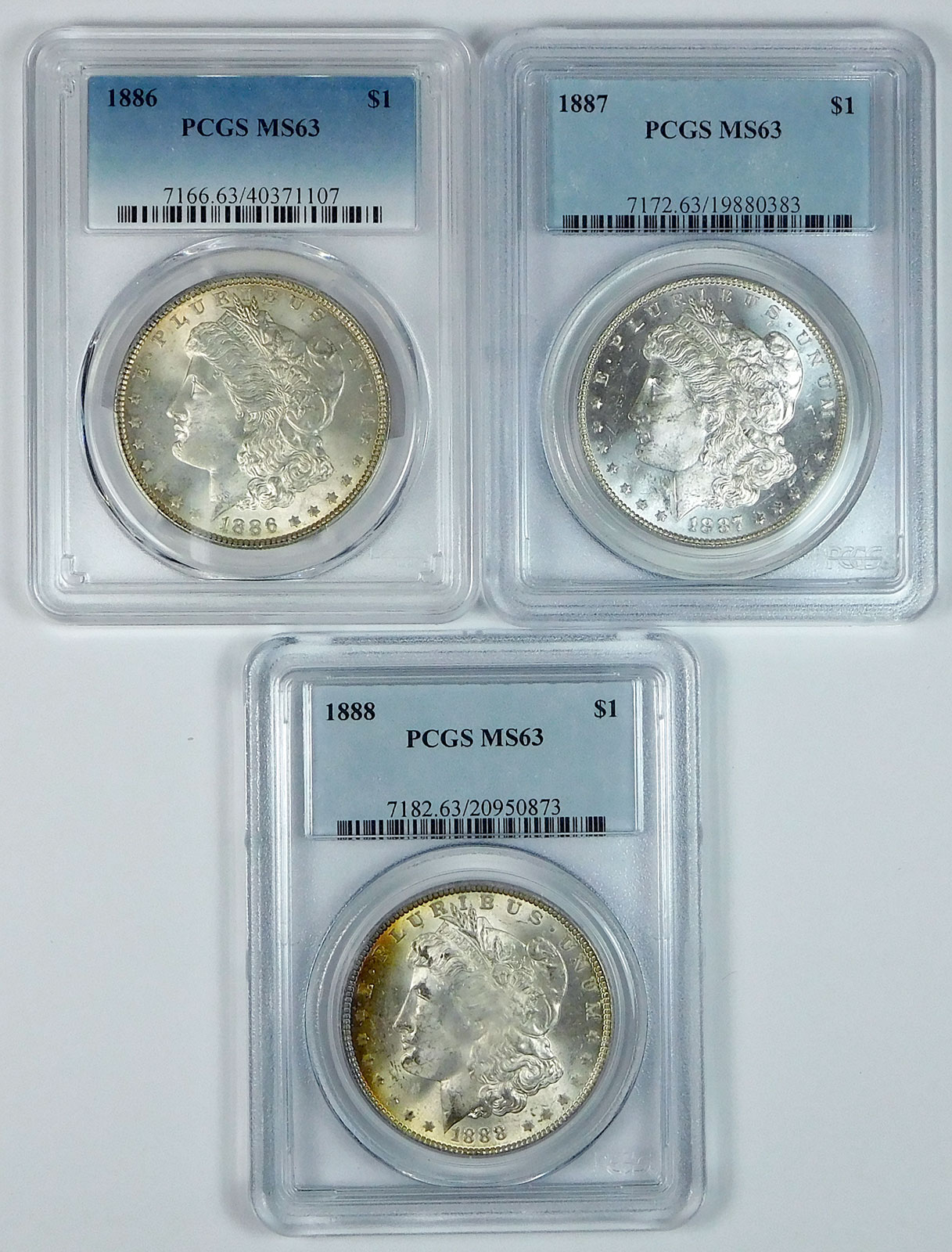 1886, 1887 & 1888 Morgan Silver Dollar Set – PCGS MS 63