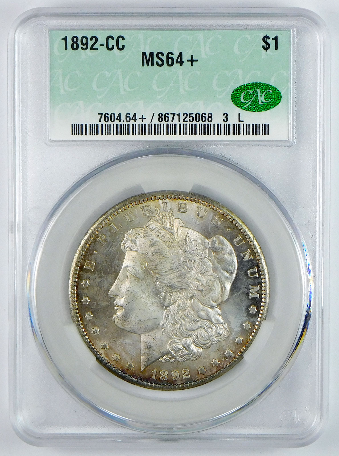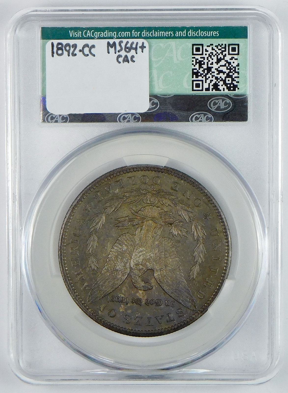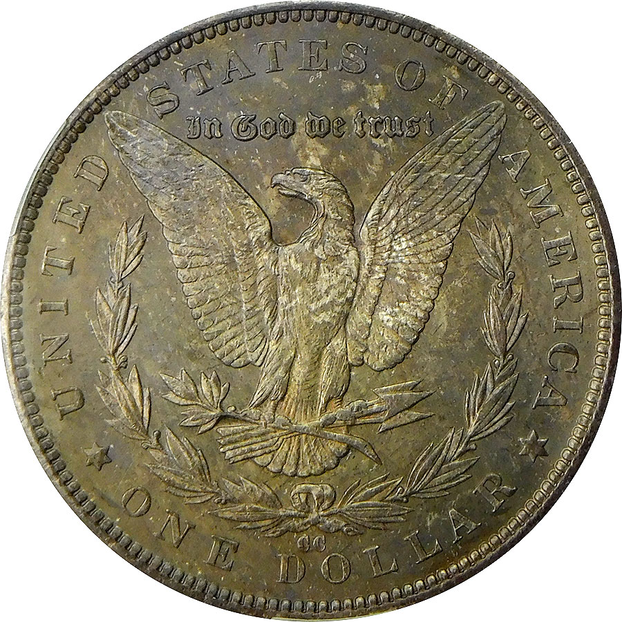 1892-CC Morgan Silver Dollar – CAC MS 64+ – Dark Reverse Toning